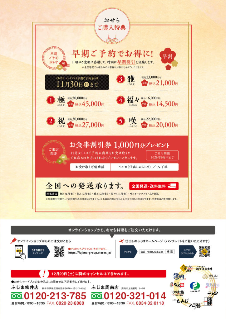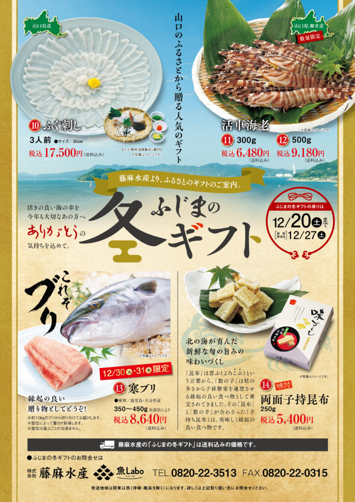 ふじま特製の「おせち」と「藤麻水産冬ギフト」のご予約を、12月20日(土)まで承り中です。