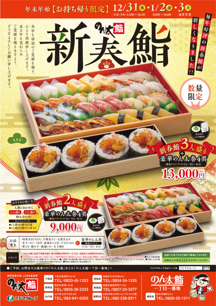 ※12/31と1/2の二日間は、山口県内6店舗並びにのん太鮨一丁目一番地柳井店は、事前ご予約いただいた新春鮨お受け渡しのみの特別営業とさせていただきます。紙屋町店は時間を短縮した通常スタイルの営業をいたします。(12/31は16時オーダーストップ・16時30分閉店、1/2は15時30分オーダーストップ・16時閉店)